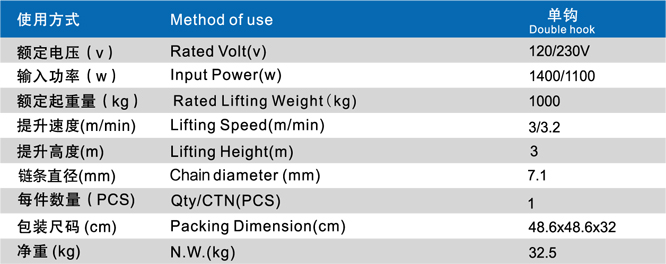 采用吊鉤懸掛式或吊環(huán)懸掛式安裝采用機(jī)械制動(dòng)和上下行程開關(guān)控制;采用高強(qiáng)度起重環(huán)鏈?zhǔn)褂脡勖L采用110V、230V單相電源。
