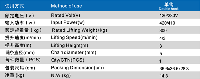 采用吊鉤懸掛式或吊環(huán)懸掛式安裝采用機械制動和上下行程開關控制;采用高強度起重環(huán)鏈使用壽命更長采用110V、230V單相電源。